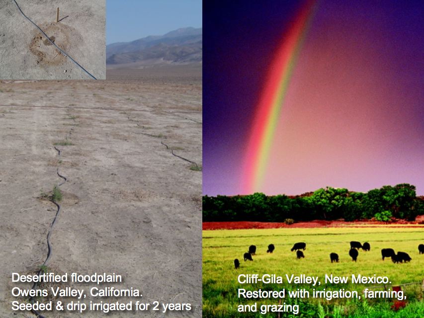 This comparison shows, on one side, a large barren floodplain with drip irrigation hoses stretching futilely into the distance. Except for a few tumbleweed seedlings at a couple of drip ports, there is not a plant to be seen. An insert in the barren-land picture shows a close-up of one of the drip ports where water oozes out of the hose. Water stains the barren soil around the port, but even here there is not a wisp of green.
