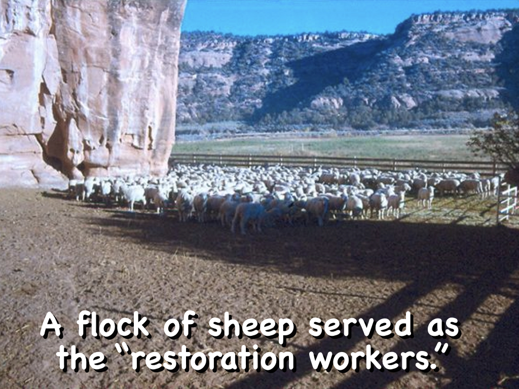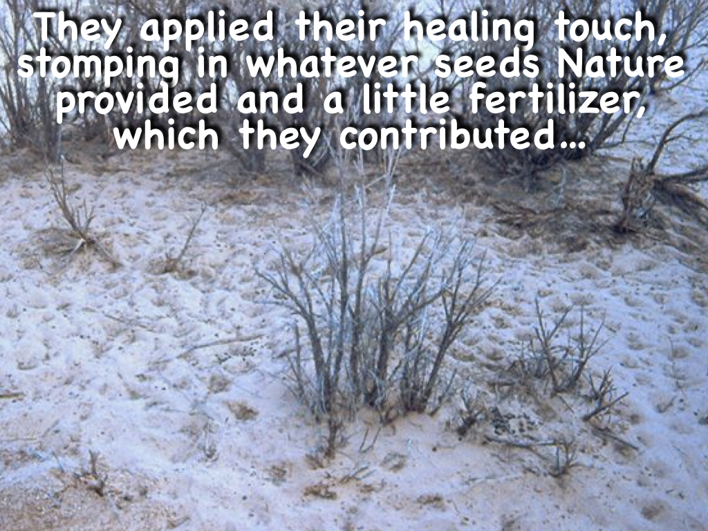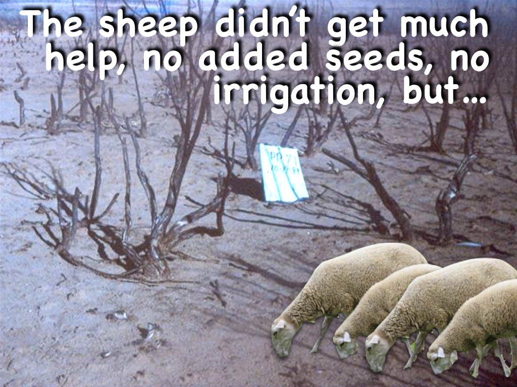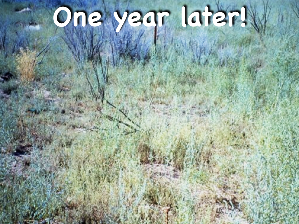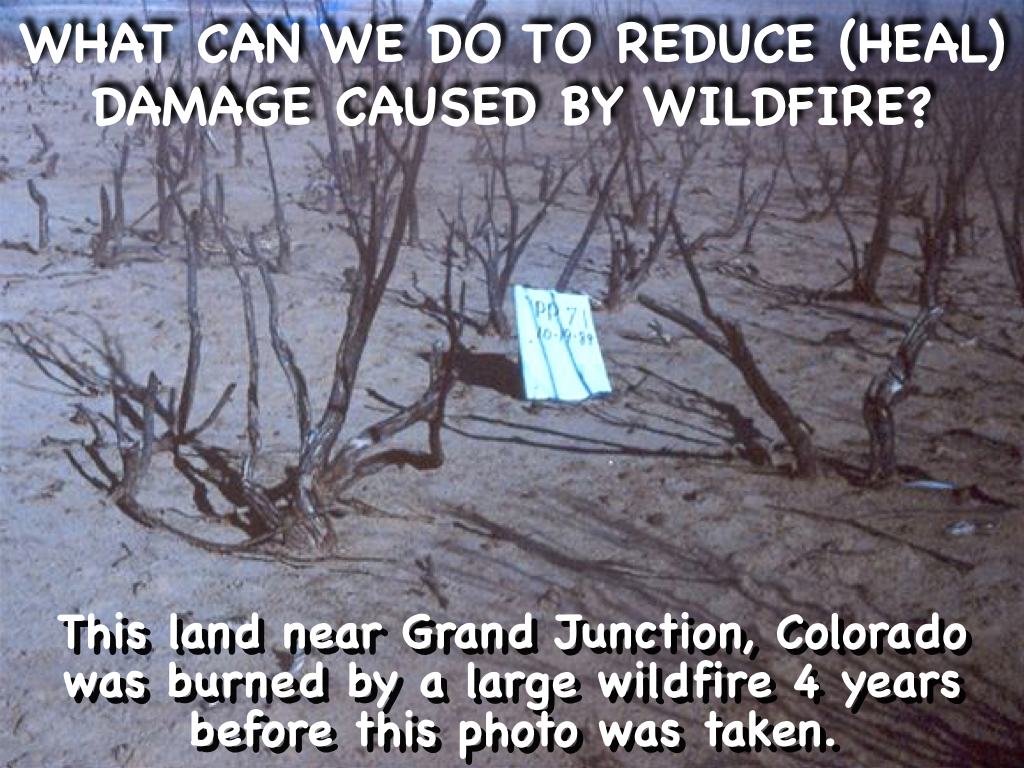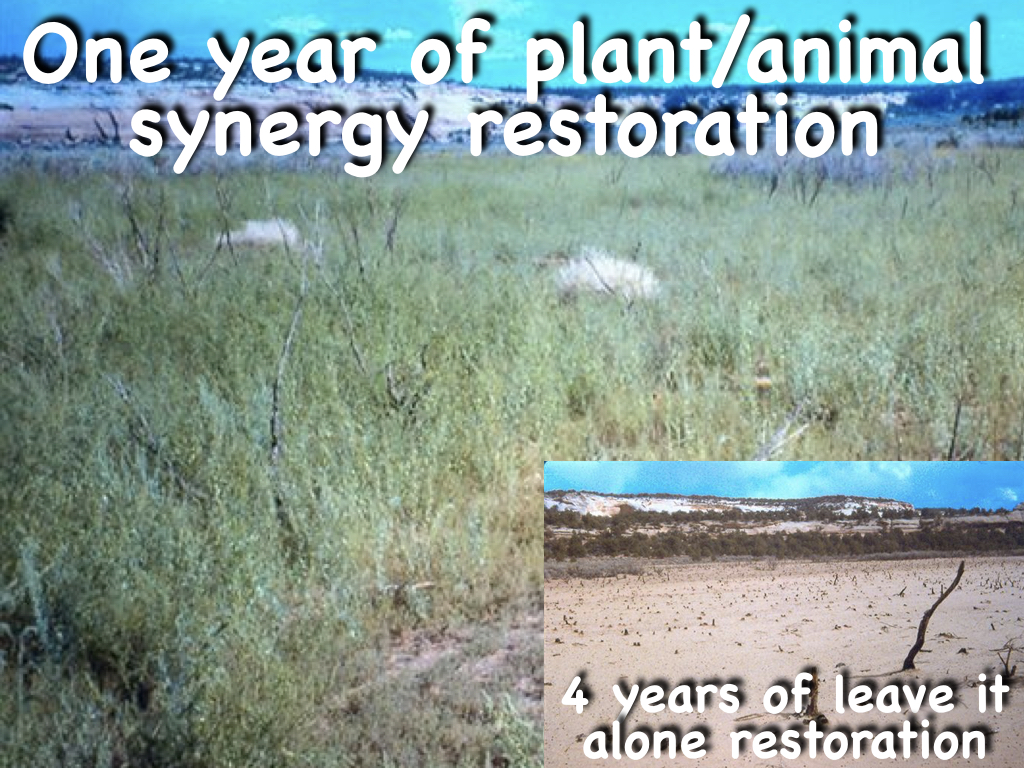 Check the example shown in the gallery below. The plant/animal synergy interaction applied by Terry Wheeler (and shown in these photos) transforms a wildfire damaged area that has remained damaged and ready to create burnscar flooding and catastrophic erosion for 4 years and turns it into a green growing, living plant area that is resistant to flood-creating runoff and moist enough to resist fire.